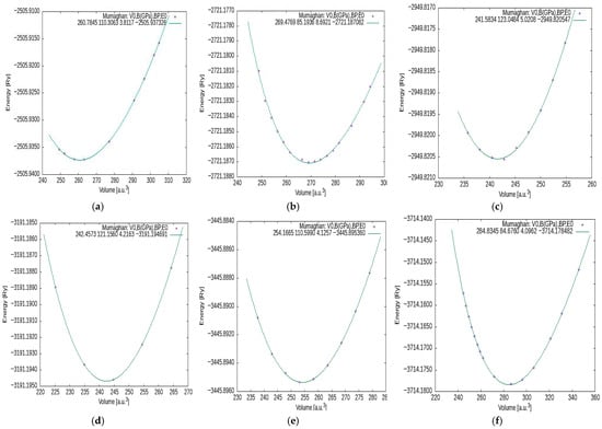 The energy–volume relationship is fitted using the EOS, an approach widely used to model the compressible behavior of solids [,,]: