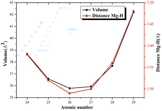 Values of volume and distance between Mg-H associated with elements.