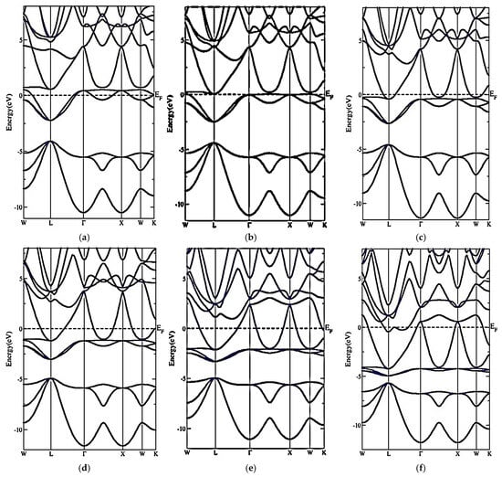 The electronic band structures of MgXH3 magnesium hydrides are shown in Figure 5. A detailed analysis of these structures reveals an overlap between the conduction and valence bands, characteristic of pronounced metallic behavior for all the compounds studied []. This phenomenon is directly linked to the electronic stability of the hydrides, indicating a progressive decrease in their structural stability, resulting in a shift in electronic states towards the conduction bands []. This trend, observed through theoretical calculations, is in agreement with experimental results reported in the literature []. A detailed analysis of the atomic contributions to the electronic structure of MgXH3 makes it possible to identify the role of each element in the formation of conduction and valence bands. Examination of Figure 5a reveals that MgCrH3 exhibits notable contributions from Cr and hydrogen in the conduction band, while magnesium plays a prominent role in the valence band. Similarly, Figure 5b shows that manganese (Mn) is the main contributor to the conduction band in MgMnH3, strongly influencing the compound’s electronic properties. In the case of MgFeH3, shown in Figure 5c, a significant contribution from iron and hydrogen is observed in the conduction band, while magnesium remains dominant in the valence band. Figure 5d illustrates that in MgCoH3, cobalt plays an essential role in the conduction band. A similar evolution is observed for MgNiH3, where nickel and hydrogen contribute strongly to the conduction band, while magnesium still dominates the valence band, as shown in Figure 5e. Finally, Figure 5f highlights that in MgCuH3, copper and hydrogen actively participate in the conduction band, while magnesium retains a marked influence on the valence band [,,]. These results underline a general trend in which magnesium remains a key player in the valence band, while transition atoms (Cr, Mn, Fe, Co, Ni, Cu) and hydrogen are predominantly involved in the conduction band []. This electronic distribution directly influences the metallic properties of the compounds and can be correlated with their stability and potential applications in catalysis and hydrogen storage.