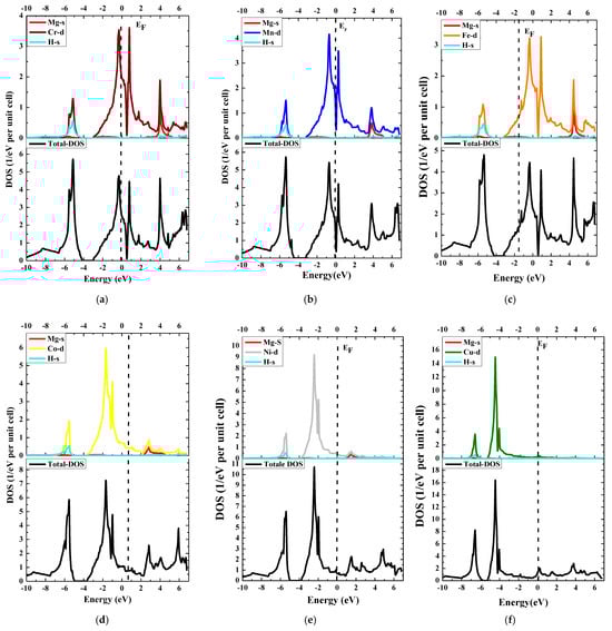 TDOS and PDOS: (a) MgCrH3, (b) MgMnH3, (c) MgFeH3, (d) MgCoH3, (e) MgNiH3 and (f) MgCuH3.