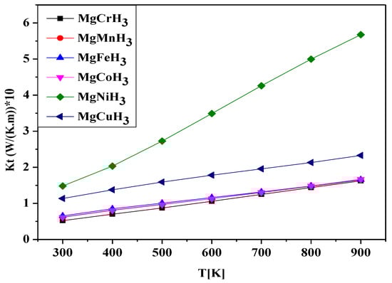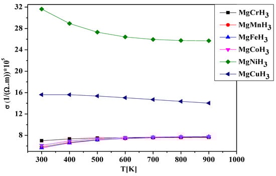 The electrical conductivity (σ) of MgXH3 as a function of temperature is presented in Figure 7. The results reveal contrasting trends depending on the nature of the transition metal. Specifically, the conductivity of MgNiH3 and MgCuH3 decreases with increasing temperature, whereas for MgCrH3, MgMnH3, MgFeH3, and MgCoH3, σ increases gradually up to 900 K. At this temperature, the corresponding conductivity values are 2.50 × 106, 1.40 × 106, 7.40 × 105, 7.44 × 105, 7.50 × 105, and 7.52 × 105 (1/(Ω·m)) for MgNiH3, MgCuH3, MgCrH3, MgMnH3, MgFeH3, and MgCoH3, respectively. These results indicate that the type of transition metal plays a key role in determining the electrical response of the material with temperature.