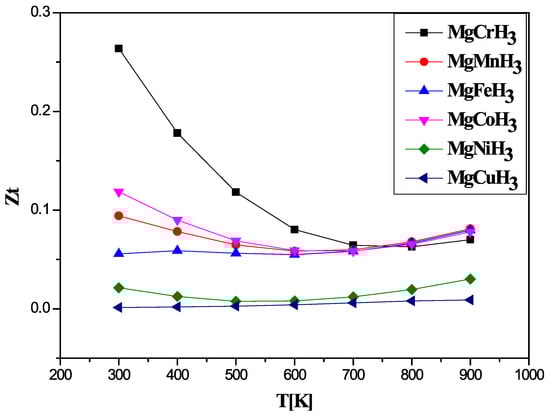 Examining the specific trends, we observe a divergence in behavior between the different compounds. For MgCrH3, MgMnH3, and MgCoH3, Zt decreases with increasing temperature, suggesting a progressive degradation of their thermoelectric properties at high temperatures. In contrast, MgFeH3, MgNiH3, and MgCuH3 show an increase in Zt with temperature, reaching maximum values of 0.1, 0.115, 0.08, 0.12, 0.05, and 0.03, respectively, at 900 K. These results indicate that electronic and phononic interactions vary considerably depending on the transition metal involved in the MgXH3 structure. Furthermore, for MgMnH3, MgCoH3, and MgCrH3, values of Zt were recorded at low temperatures (300 K), reaching 0.26, 0.117, and 0.098, respectively. This indicates that these materials are possibly suited for thermoelectric applications at low temperatures, while MgFeH3, MgNiH3, and MgCuH3 perform better at high temperatures. Although the Zt values of MgNiH3 and MgCuH3 (0.12 and 0.05 at 900 K) remain below those of benchmark thermoelectrics such as Bi2Te3 and SnSe (typically ZT = 1) [,], these hydrides present a notable multifunctional potential combining hydrogen storage and moderate thermoelectric response. Further optimization with techniques such as doping or defect engineering could thus lead to improvements in their thermoelectric performance, through decreased thermal conductivity and tuning of electronic structure.