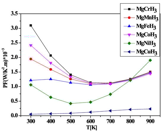 A high-power factor is sought after, particularly for high-temperature applications where the exploitation of thermal gradients is essential for power generation. In this context, a material with a power factor greater than unity is considered promising for thermoelectric devices []. Figure 10 presents a graphical representation of the power factor (PF). It is observed that while the PF of MgCrH3, MgMnH3 and MgCoH3 decreases with increasing temperature, that of MgFeH3, MgNiH3 and MgCuH3 increases. At 900 K, these compounds reach values of 1.62 × 10−3, 1.57 × 10−3, 1.55 × 10−3, 1.5 × 10−3, 1.9 × 10−3 and 2.5 × 10−4 W/(K2.m), respectively. While MgFeH3, MgNiH3 and MgCuH3 has a lower temperature of 900 K, but the MgFeH3, MgNiH3 and MgCuH3 has a lower temperature of 300 K, the material MgCrH3, MgMnH3 and MgCoH3 have a very significant (PF) value of 3.23 × 10−3 W/K2.m, 2.00 × 10−3 W/(K2.m), and 2.4 × 10−3 W/(K2.m) since its lowest temperature is 300 K. Furthermore, the presence of a high power factor for MgNiH3 indicates that this material can convert thermal energy into electrical energy more efficiently. In contrast, the low values of PF for MgCuH3 suggest a loss of thermal energy due to poor exploitation of the incoming power supply. Finally, it is important to point out that experimental and theoretical data on power factors for MgXH3 perovskites remain limited in the literature. These values can vary depending on several parameters, including chemical composition, temperature and sample purity. Future in-depth experimental and modeling studies are therefore needed to better understand and optimize the thermoelectric properties of these materials.