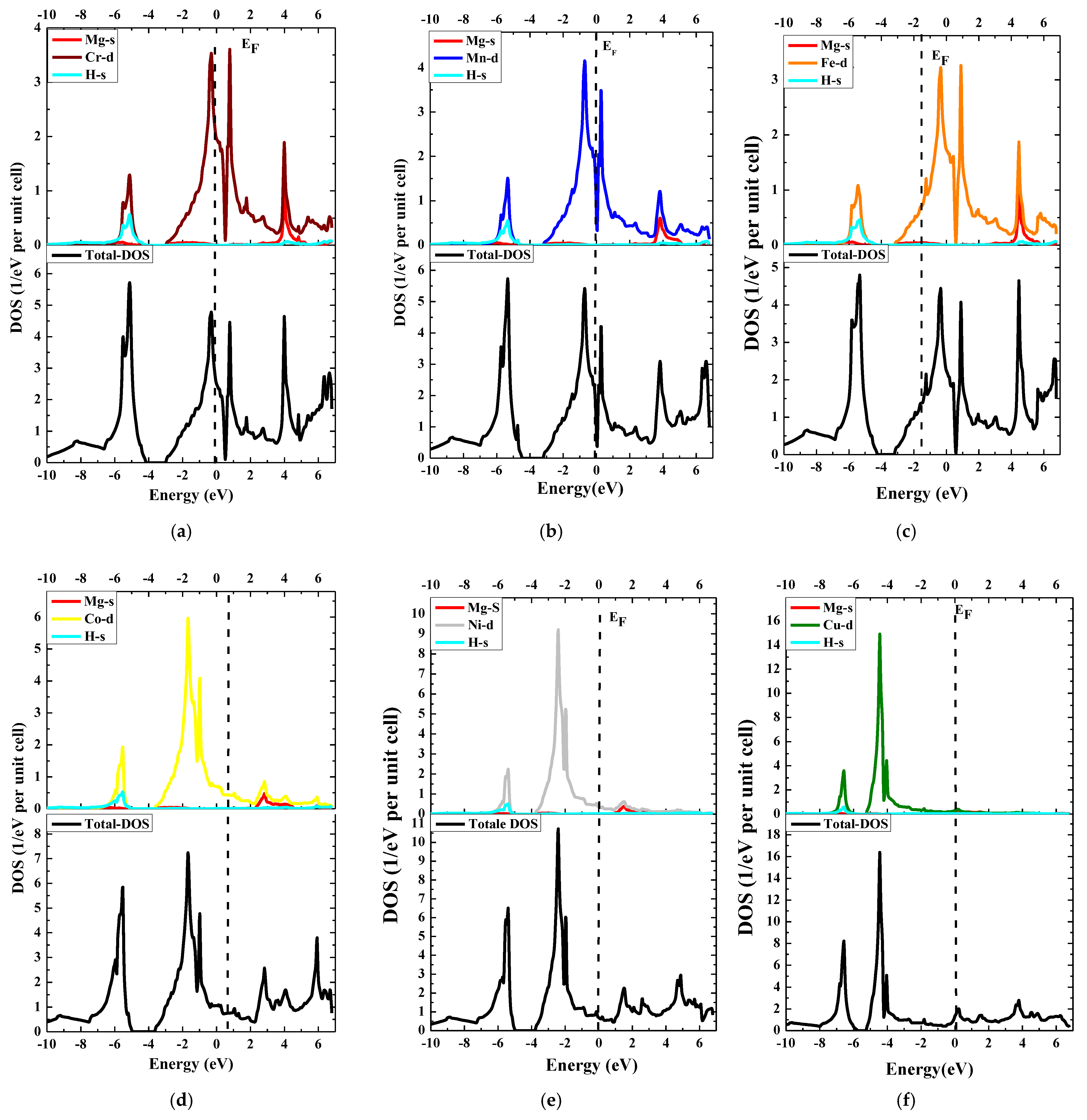 - Batalovi, K.; Radakovi, C.; Belo, C.; Kotesk, V. Transition metal doping of Mg2FeH6—A DFT insight into synthesis and electronic structure. Phys. Chem. Chem. Phys. 2014, 24, 12356–12361. [Google Scholar] [CrossRef] [PubMed]