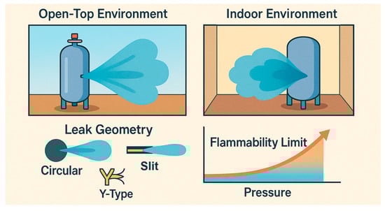- Yang, N.; Deng, J.; Wang, C.; Bai, Z.; Qu, J. High pressure hydrogen leakage diffusion: Research progress. Int. J. Hydrogen Energy 2024, 50, 1029–1046. [Google Scholar] [CrossRef]