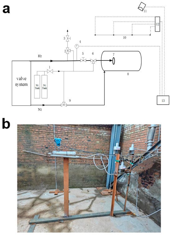 (a) Hydrogen leak diffusion test system configuration diagram; (b) Test site diagram. Description: 1—gas cylinder pressure reducing valve, 2—air release control valve, 3—air release stop valve, 4—pressure gauge, 5—main line stop valve, 6—main line gas control valve, 7—hydrogen leakage simulation device, 8—nitrogen fire ring, 9—nitrogen fire gas control valve, 10—hydrogen concentration sensor array, 11—hydrogen concentration host controller, 12—camera, 13—measurement and control as well as video surveillance system.