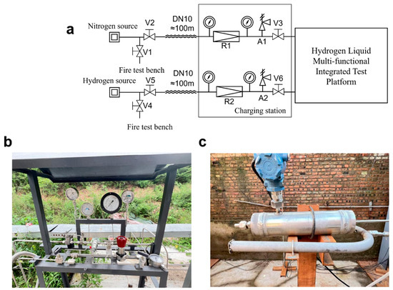 Gas-supply piping system comprises shut-off valves, pressure-reducing valves (PRVs), safety relief valves (SRVs), pressure gauges, and stainless-steel tubing. It is divided into a nitrogen line and a hydrogen line, both routed from the cryogenic-plant fire-exposure test stand. The nitrogen line is approximately 100 m in total length. A safety relief valve A1 provides over-pressure protection, and a pressure-reducing valve R1 regulates the outlet pressure. Pressure gauges are installed both upstream and downstream of the PRV. The hydrogen line is also about 100 m long. A safety relief valve A2 serves for over-pressure venting, while pressure-reducing valve R2 controls the outlet pressure. Pressure gauges are installed on both sides of the PRV. A site photograph is provided in Figure 3b. All hydrogen transfer lines use German-made MAXIMATOR tubing (3/8-in OD, 316 stainless steel) (MAXIMATOR GmbH, Nordhausen, Germany) rated for a maximum working pressure up to 150 MPa. Pneumatic valves are German-made MAXIMATOR units fitted with solenoid pilots, enabling remote actuation and control. Manual valves are likewise MAXIMATOR shut-off valves, offering high reliability.