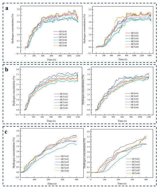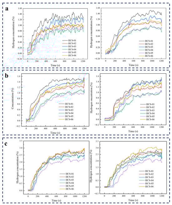 As illustrated in Figure 4a–c, hydrogen concentration sensors were arranged within a 5 m × 4 m × 3 m volume centered around the leakage nozzle, which served as the region of interest. Unlike the outdoor small-scale tests, the indoor experiments were conducted in a larger enclosed space measuring 12 m × 6 m × 6 m. In this setup, the hydrogen jet does not interact with walls, thus avoiding wall reflection and subsequent diffusion. As a result, placing sensors behind the jet nozzle would likely fail to capture significant hydrogen concentration signals. Therefore, the sensors were strategically placed in the half-space located in front of the jet nozzle. Given that the space is a regular rectangular cuboid and exhibits axial symmetry, the hydrogen sensors were deployed in the right half of the jet direction. The entire 5 m × 4 m × 3 m sensing volume was centrally located within the 12 m × 6 m × 6 m room, with the jet nozzle positioned 1.5 m above the ground.