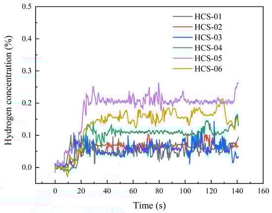 When the leakage orifice was a 0.5 mm circular hole and the leakage pressure was 3 MPa, the temporal variations of hydrogen concentration are shown in Figure 8. The response times of all sensors ranged from 8 to 16 s. Sensors No. 1 and No. 5 responded the fastest (≈8 s), followed by sensors No. 2 and No. 3 (≈10 s), while sensors No. 4 and No. 6 responded at about 16 s. Due to the small orifice size, the leakage rate was relatively low, resulting in lower overall concentration levels. The concentration profiles were strongly affected by natural outdoor wind, showing considerable fluctuations. The highest average concentration was observed at sensor No. 5 (≈0.209%), followed by sensor No. 6 (≈0.166%). Sensor No. 4 showed smaller fluctuations, with an average of ≈0.113%. Sensors No. 1, 2, and 3 stabilized at similar levels of ≈0.068%.