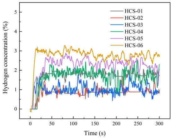 When the leakage orifice was a 0.5 mm slit and the leakage pressure was 3 MPa, the temporal variation of hydrogen concentration in the outdoor test space is shown in Figure 9. The response times of hydrogen concentration at all sensor positions ranged from 6 to 25 s. Sensor No. 3 responded the fastest, at about 6 s, followed by sensor No. 2. Sensors No. 1 and No. 6 had nearly identical response times of about 13 s. The response time of sensor No. 5 was about 18 s, while that of sensor No. 4 was 25 s. Due to the influence of natural outdoor wind, the concentration curves still fluctuated considerably. Among them, sensor No. 3 showed the highest average concentration and the fastest growth, fluctuating around 2.381%. Sensor No. 6 exhibited the largest fluctuations, with an average concentration of about 1.201%. Sensor No. 1 fluctuated around 1.346%, while sensor No. 2 averaged around 1.736%. At sensor No. 4, the average concentration was about 0.438%, with large fluctuations. Sensor No. 5 also showed strong fluctuations, with an average concentration of around 0.174%.