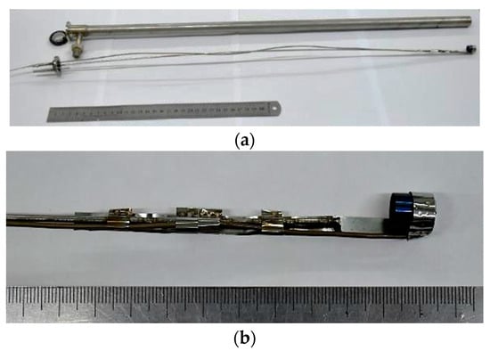 For the hydrogen sorption–desorption experiments with Mg56Al44 samples, a custom-designed experimental device (ED) was fabricated from stainless steel tubing, equipped with a crucible holder and an internal type-K thermocouple. The crucible was made of 12Cr18Ni10T stainless steel and fixed on a 1 mm diameter steel wire, which allowed accurate positioning of the specimen inside the ED [,,,,,,]. Heating was provided by a resistive heater wound around the outer surface of the device. A photograph of the ED without the heating element is shown in Figure 1.