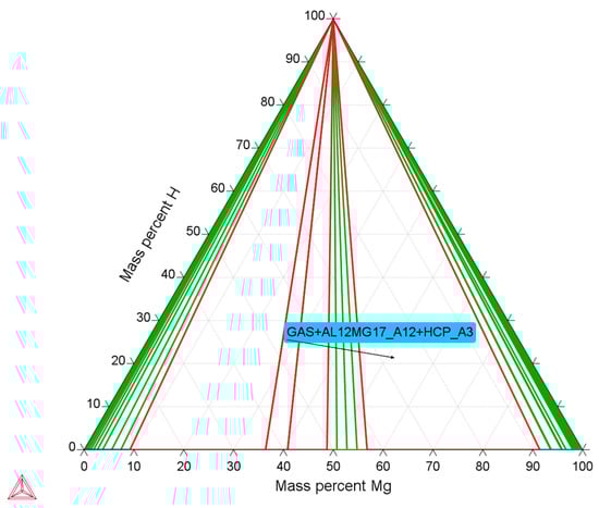 To investigate the phase evolution and determine the optimal synthesis parameters in the Mg-Al system, thermodynamic modeling was carried out using the CALPHAD approach. Particular attention was paid to compositions close to the Mg56Al44 stoichiometry, which is considered promising for hydrogen storage materials []. Figure 2 shows an isothermal section of the Mg-Al-H system. The model predicts that, in the Mg-enriched region (40–60 at.% Mg), the stable phase field corresponds to the three-phase equilibrium of Mg + Mg17Al12 + H2.