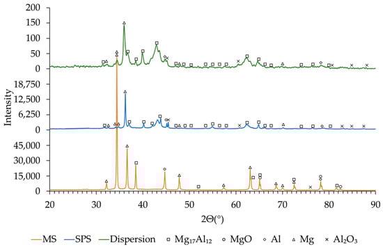 According to the XRD patterns (Figure 5), at the stage of MS (blue curve), diffraction peaks corresponding to Mg, Al, and the intermetallic Mg17Al12 are observed, along with minor reflections of MgO. After SPS, the intensity of the Mg and Mg17Al12 peaks increases, which is associated with diffusion reactions and the formation of stable intermetallic compounds []. At the final dispersion stage, the peaks of Mg and Mg17Al12 become less intense and broadened, indicating enhanced dispersion and a reduction in crystallite size [], as confirmed by the data in Table 2.