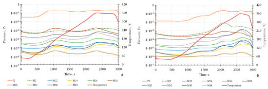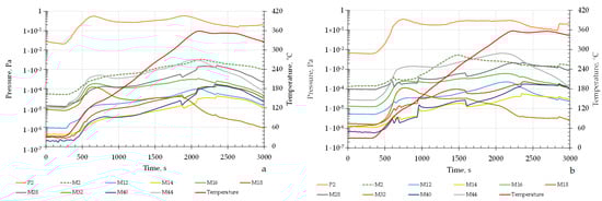 For the sample in Figure 8b, hydrogen release starts earlier, at 180 °C, and proceeds more intensively. In the 300–380 °C range, the partial pressure of H2 rises to 10−2–10−1 Pa, i.e., an order of magnitude higher compared to the sample in Figure 8a. The release curve exhibits distinct peak-like features, indicating localized degassing centers and increased structural defectiveness [].