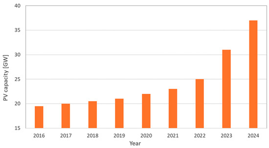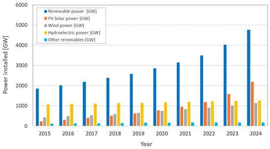 On a global scale, renewable energy technologies have experienced a remarkable diffusion, supported by falling costs, technological improvements, and targeted national and international incentive schemes. Many countries have significantly expanded their installed capacity, with solar photovoltaic (PV) and wind power representing the largest contributors to the growth of clean energy generation [9]. This global trend highlights a structural shift towards more sustainable energy systems, aiming to reduce dependence on fossil fuels and mitigate the effects of climate change. The recent expansion of renewables has been primarily driven by photovoltaics, with over 1000 GW of new capacity added worldwide in the past three years. Figure 1 illustrates the evolution of installed capacity over the past 10 years, showing photovoltaic, wind, and hydropower separately, while the total installed capacity also includes contributions from other sources such as biomass and geothermal, highlighting the relative share of each technology. This remarkable growth highlights both the economic competitiveness of solar power and the maturity of a technology that is well established and easily replicable. While this is undoubtedly positive, it also brings side effects, as noted by the author in earlier works [10,11]. Moreover, the focus on electricity production, accounting for only about 20% of global energy consumption, means that the rapid rise of solar does little to address other critical sectors, such as energy for industrial heat and energy for mobility. In this context, Italy has followed the global increase. At the end of the year, total installed capacity from PV power plants had reached approximately 38 GW, marking an increase of about 8 GW compared to 2023 [12], (Figure 2).