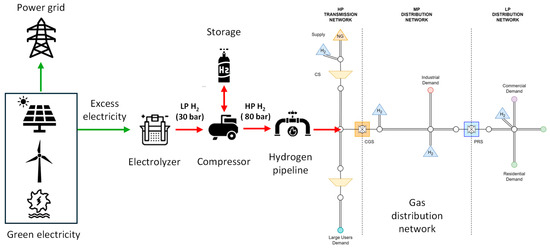 The concept of hydrogen integration into the natural gas grid. Green arrows indicate renewable energy, while red arrows represent the hydrogen pathway.