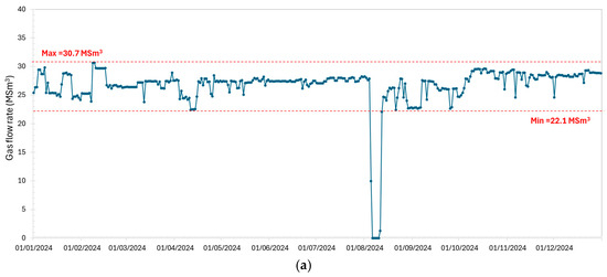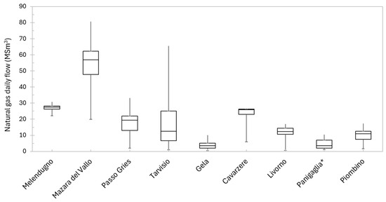 Table 6 reports the statistical distribution of daily and hourly gas flows for four reference days in 2024, providing key indicators such as minimum, mean, and standard deviation. These values are useful to define realistic flow thresholds for hydrogen injections, avoiding both production oversizing and surplus volumes that cannot be absorbed by the grid. Figure 5 complements this data by showing the daily flow trends at the Melendugno (a) and Tarvisio (b) reception points in 2024, thus illustrating the temporal variability underlying the summarized statistics (similar data are reported in Appendix A). At Melendugno, except for a pipeline interruption, flows ranged between 22.1 and 30.7 MSm3/day (average 26.7 MSm3/day), allowing for a hydrogen volume flow up to 0.5 MSm3/day. The Tarvisio point displayed greater variability, with peaks of 65.4 MSm3/day but typical values between 5 and 20 MSm3/day. Figure 6 presents box plots summarizing the daily gas flows at each reception point, highlighting the site-specific differences already observed in Figure 5. Finally, hourly flow data (Table 7) confirm the limited intra-day variability, with standard deviations much lower than daily values. Considering the total, daily, and hourly gas import volumes reported in Table 5, Table 6 and Table 7, respectively, it is therefore possible to estimate the potential amount of hydrogen that could be injected into the natural gas network without significantly altering its composition and while remaining within acceptable operational limits.