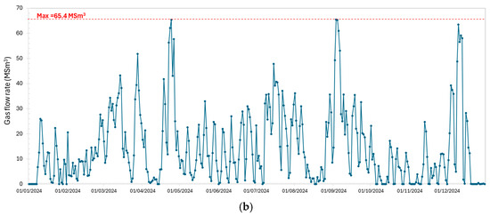 Daily flow rates during 2024 at the reception points of Melendugno (a) and Tarvisio (b).