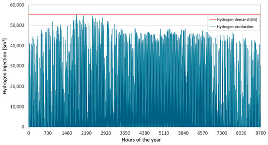 The total mass of hydrogen that can be injected into the natural gas grid can be easily connected with electricity production from the PV system.