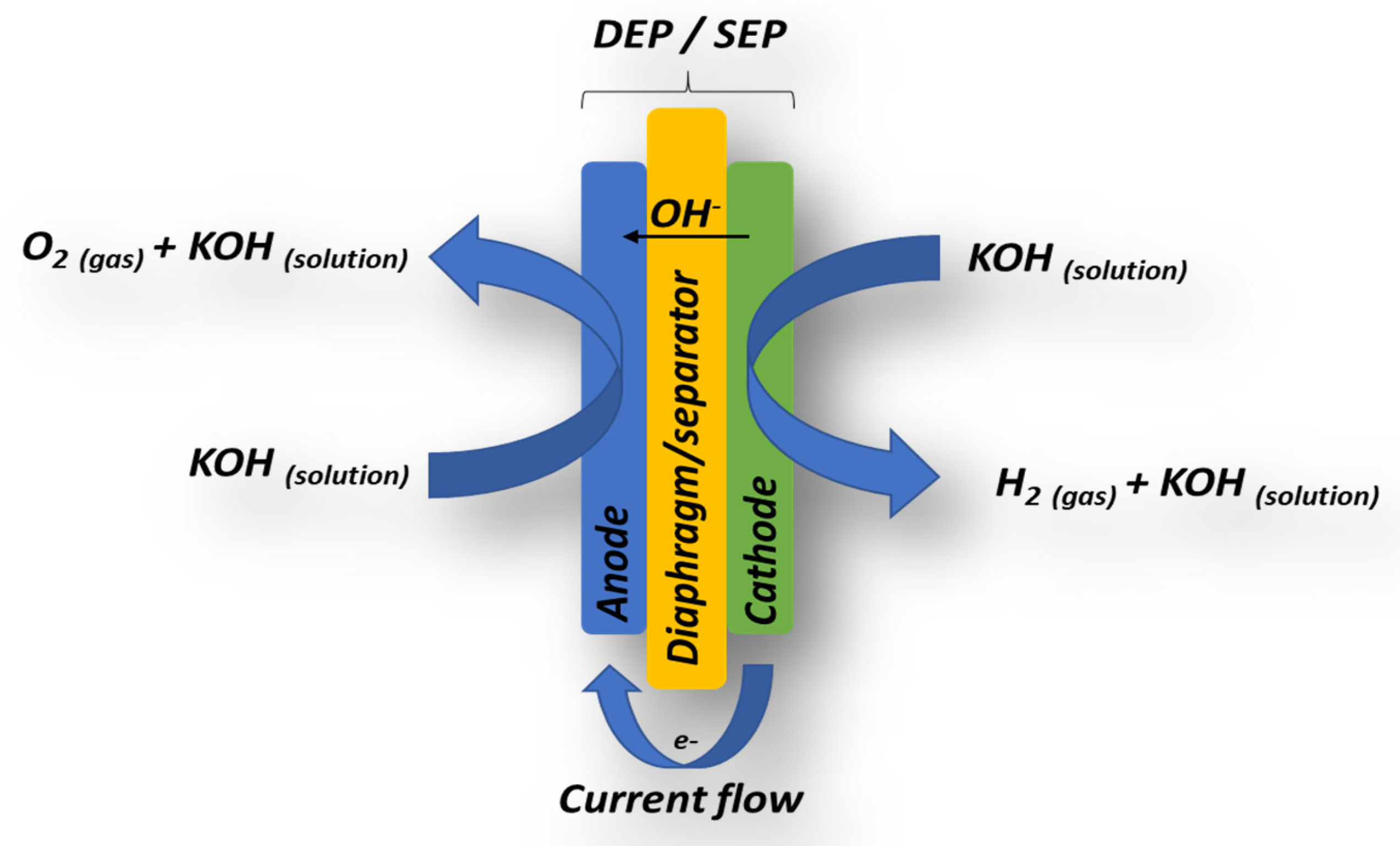 The diaphragm/separator–electrode package (DEP) consists of two porous metallic electrodes positioned on either side of the diaphragm or separator. The electrolyte solution, typically 32% KOH, is introduced at the cathodic side of the DEP, where, under the influence of an applied electric current, water molecules are dissociated into hydrogen gas and hydroxyl ions (Equation (1)). The generated OH