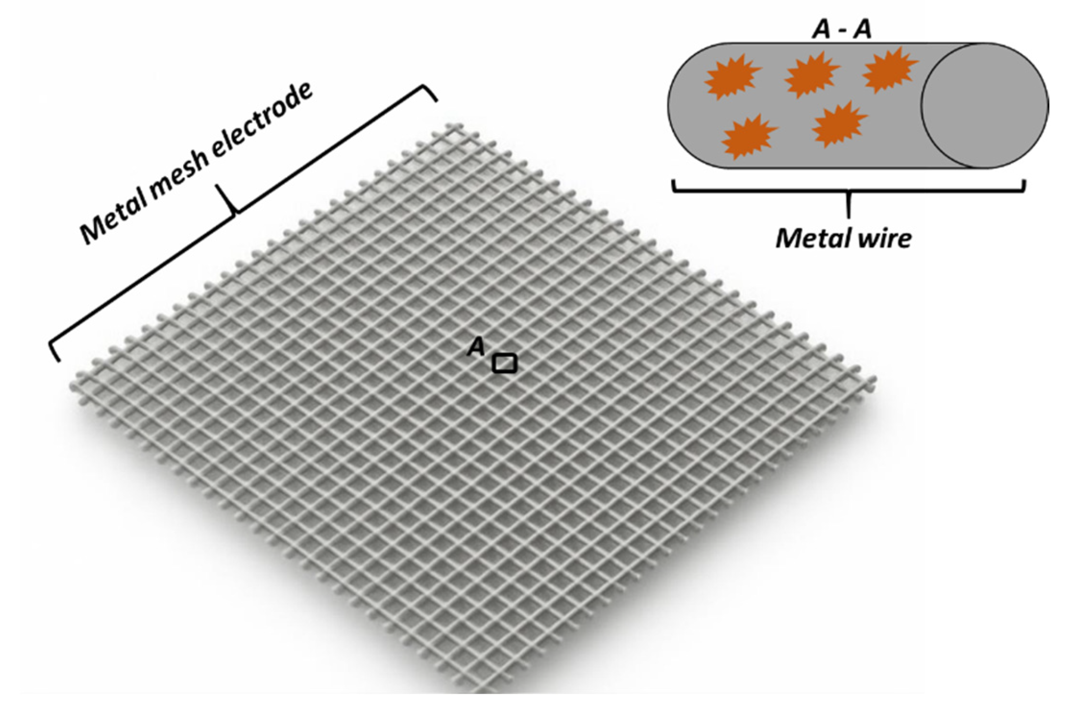 Synthesis of high-performance metal-based electrodes: Metal mesh electrodes were fabricated from stainless steel (SS316) with a 0.5 mm-mesh opening of 0.5 mm and a wire thickness of 0.5 mm, configured in an anchor-type weave. The geometric surface area of each electrode was 16 cm