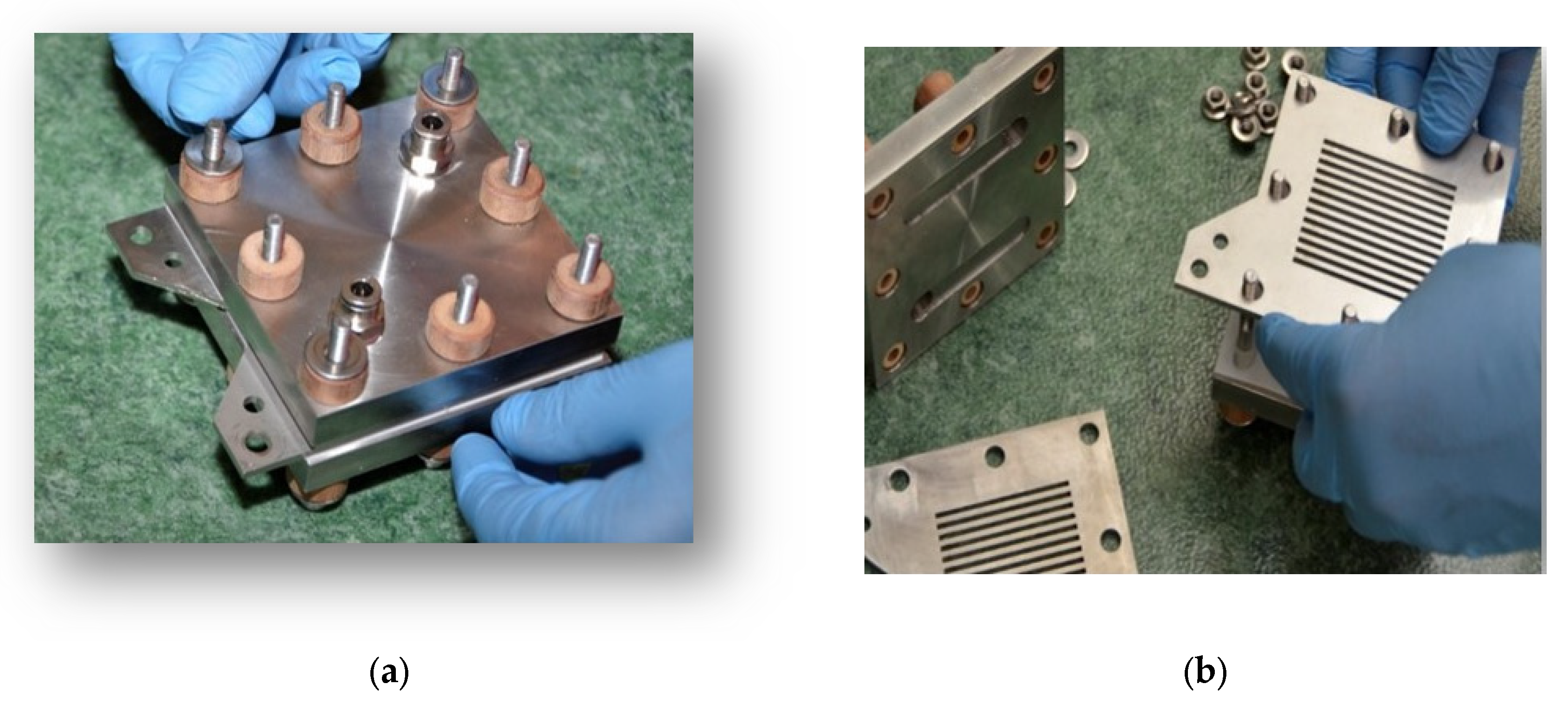 Figure 3), registered as a utility model with the Bulgarian Patent Association at [BG/U/2019/4341] and with a mechanical strength of 8 N m per screw. The electrochemical performance of the DEPs was evaluated using linear sweep voltammetry (LSV) at cell voltages ranging from open-circuit voltage (OCV) V to 2.8 V, both at room temperature and at an elevated temperature of 80 °C. For these measurements, a Gamry Reference 3000 potentiostat–galvanostat equipped with an integrated booster capable of up to 30 A was employed. The electrolyte was circulated using a peristaltic pump (Hey Flow 120) controlled via an open-source Putty terminal program, with a dual-head configuration delivering a flow rate of 2 mL min