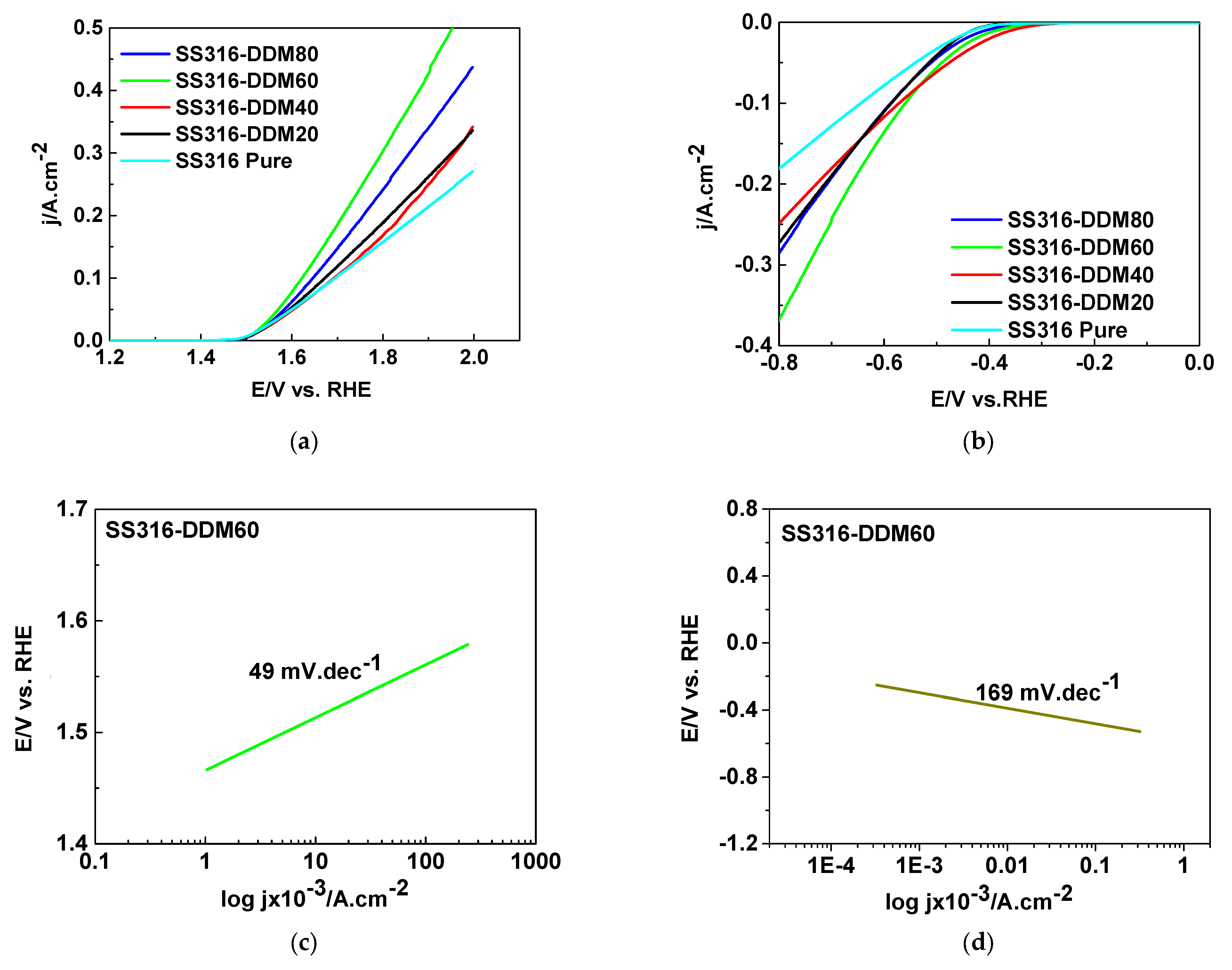 As can be seen, the highest current densities were obtained on the SS316-DDM60 electrode. The Tafel slope was obtained from the LSV curve (