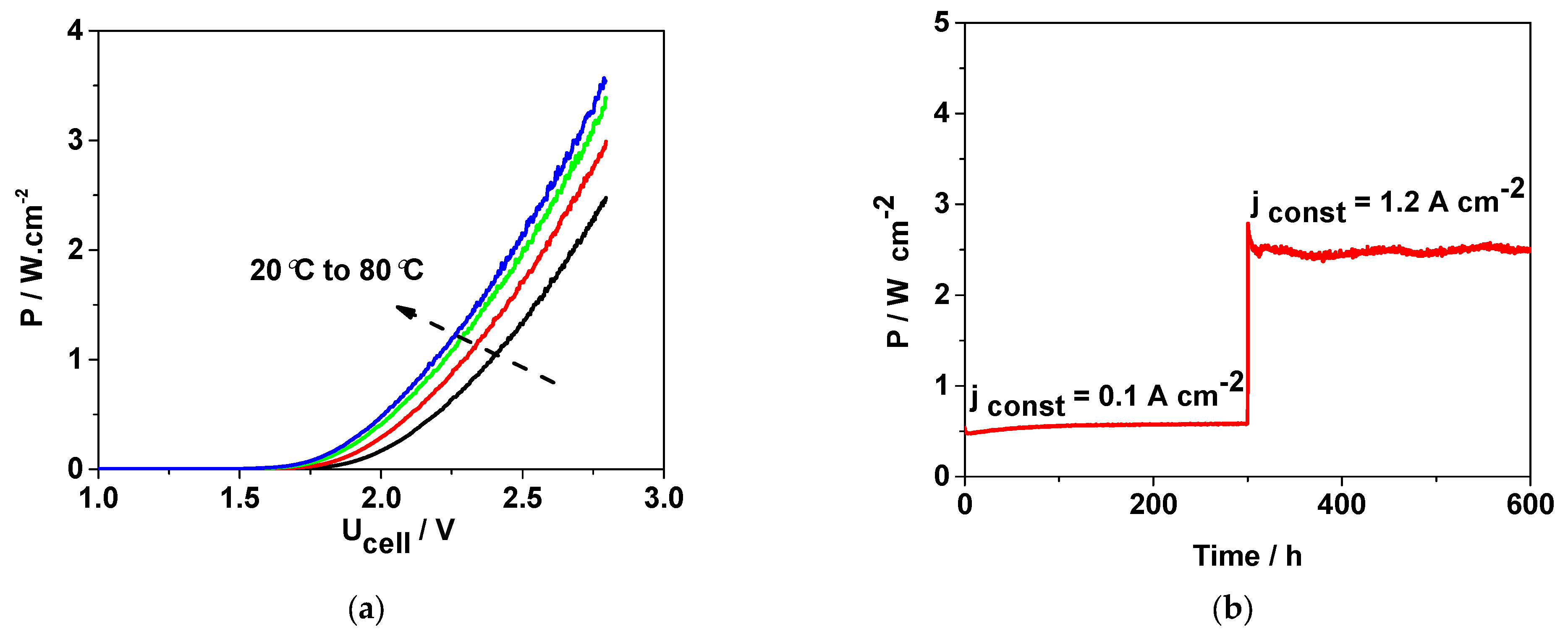 Increasing the operating temperature of the cell resulted in a decrease in the onset cell voltage from approximately 1.85 V at 20 °C to 1.70 V at 80 °C, which significantly improved the overall energy efficiency of the electrolyzer. Furthermore, at elevated temperatures, the current density reached values of about 1.4 A cm−2, corresponding to an increase in hydrogen production by approximately two-thirds compared to operation at room temperature.