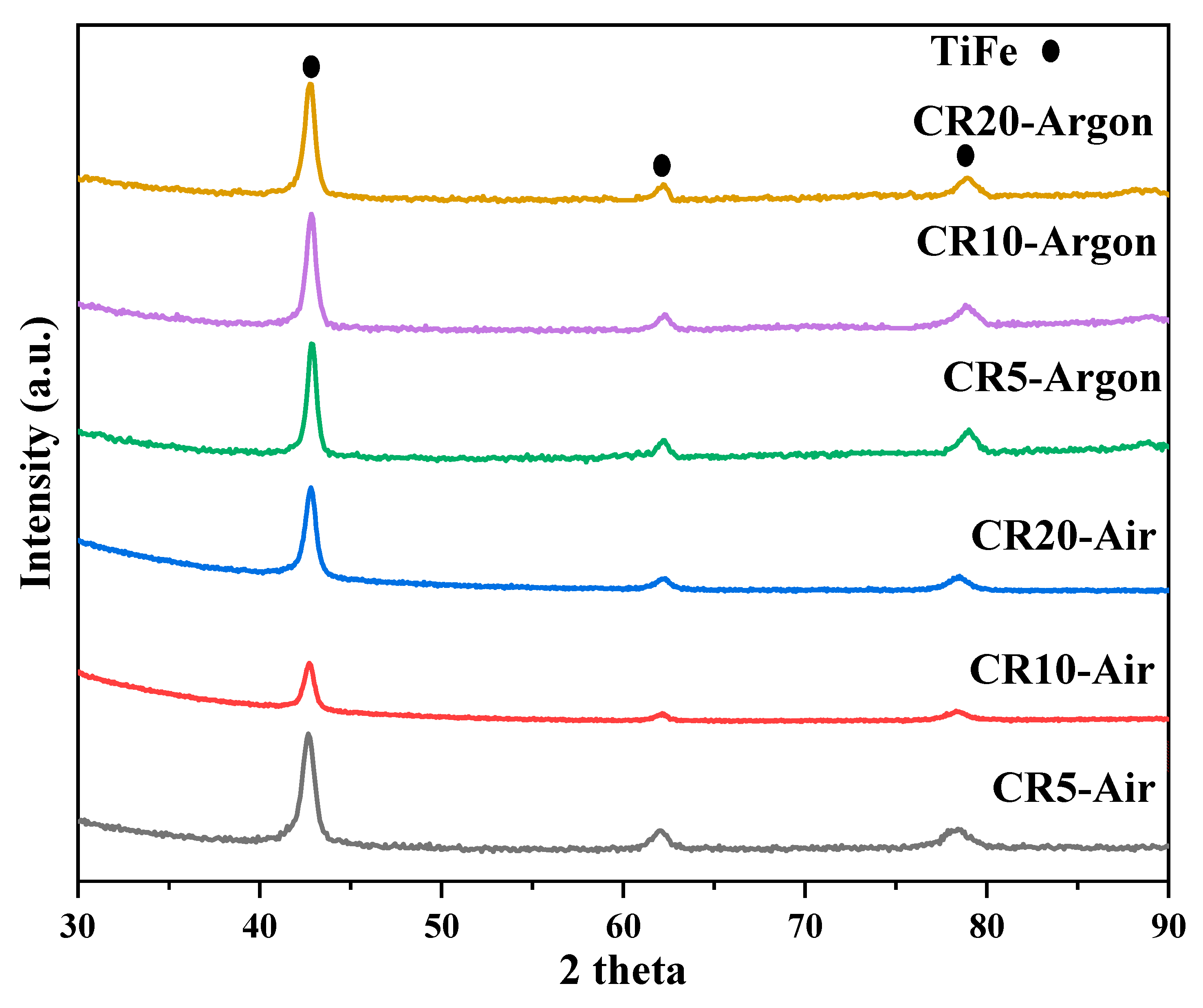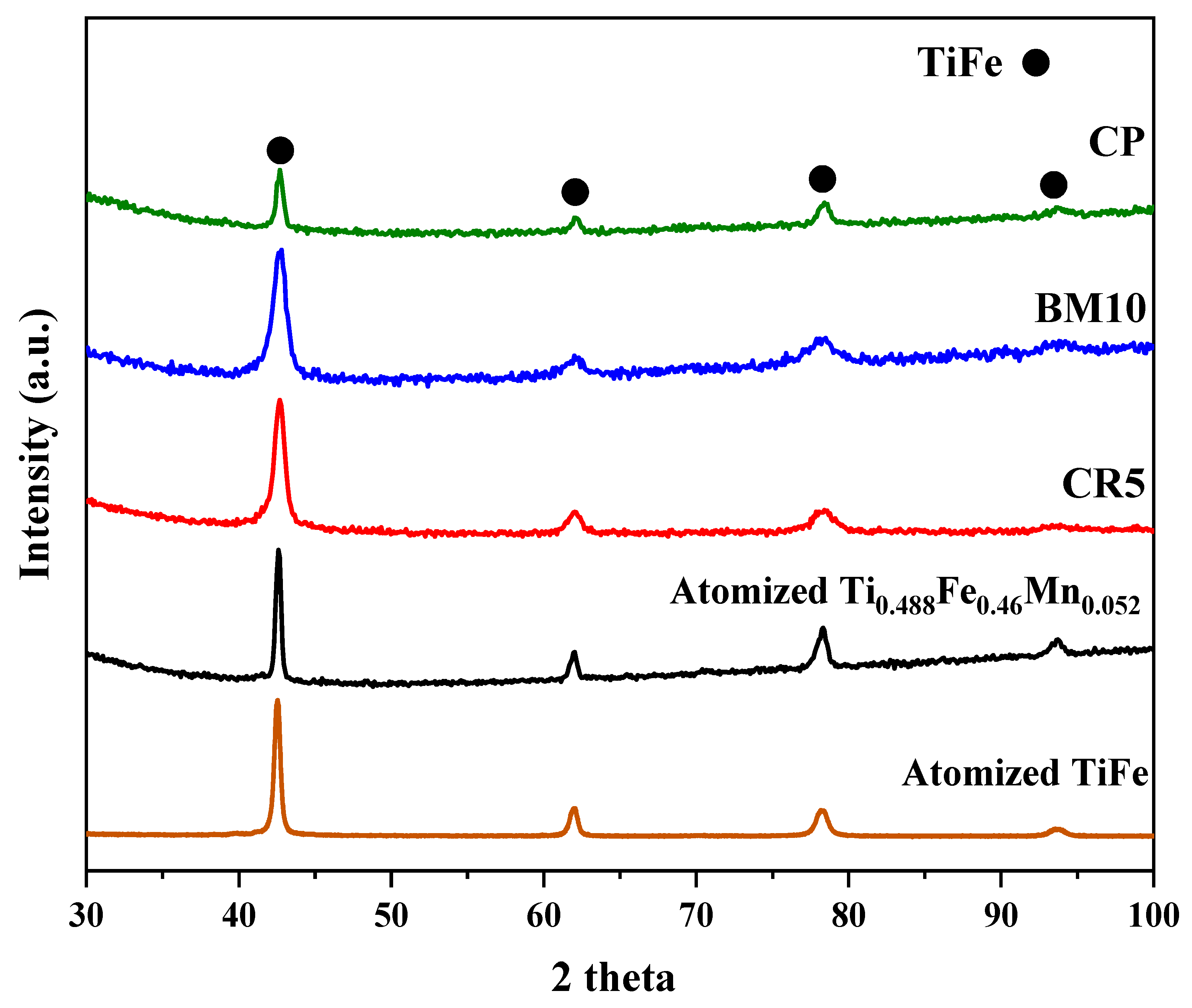 - Patel, A.; Huot, J.; Sharma, P. Hydrogen storage properties of TiFe + X wt.% Zr, V (X = 0, 4) alloys. In Proceedings of the 2016 Canadian Association of Physicists (CAP) Congress, Ottawa, ON, Canada, 13–17 June 2016. [Google Scholar] [CrossRef]