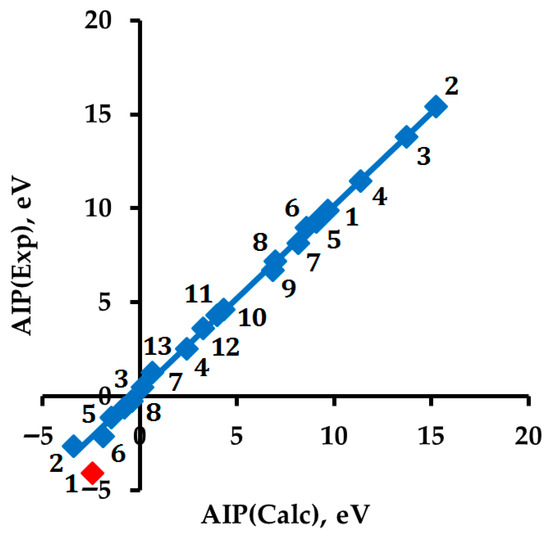 Correlation between DFT-calculated and experimental values of AIP(Mol or Rad) and AIP(RA or An) = AEA(Mol or Rad): AIP(Exp) = 0.9874·AIP(DFT) + 0.2702, R2 = 0.9984. Different points with the same number refer to different physical characteristics (AIP and AEA) of one substance (see Table 1 and Table 2). The red-marked point (−2.43; −4.11), which refers to RA 1, is an outlier from the correlation.