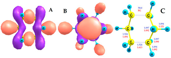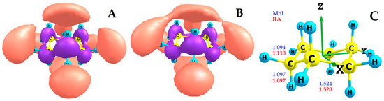 (A) LUMO of the c-C6H12 molecule; (B) SOMO of c-C6H12•− RA; (C) Axes and DFT-calculated bond lengths of the cyclohexane molecule and RA.