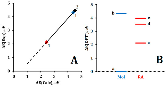 (A) Correlation between DFT-calculated and experimental values of ∆E parameters of 1 (Blue), 2 (Black) molecules and RA 1 (Red): ∆E(Exp) = 1.167·∆E(Calc) − 0.8258, R2 = 1; (B) DFT-calculated with correction values of ∆E parameters: (a) ∆E(DFT’) = 0 corresponds to E(c-C6H12) = −235.671105366798 Eh, (b) dissociation energy D(C-H) of c-C6H12, (c) relative energy ΔE(c-C6H12•−) of RA 1 formation, (d) and (e) dissociation energy D(C-H) of c-C6H12•− plus ΔE(c-C6H12•−) for reactions (10) and (11), correspondently (see Table 3).