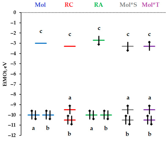 The composition and energies of the frontier orbitals of the cyclohexane molecule determine the composition and energies of the frontier orbitals, as well as the reactivity, of its radical ions, RC and RA. Due to the presence of a third-order symmetry axis in the cyclohexane molecule (overall D3d symmetry), the highest occupied molecular orbital (HOMO) exhibits twofold degeneracy [65]. According to Koopmans’ theorem, for the cyclohexane molecule, the experimental value of VIP = 10.3 ± 0.2 eV [11], taken with a negative sign, determines the HOMO energy, that is, E(HOMO) = -VIP.