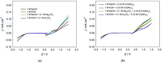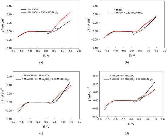 Figure 1 shows paired cyclic voltammograms (CVAs) recorded in the investigated alkaline solutions, both in the presence and absence of urea, with varying contents of inorganic components. In Figure 2, for ease of comparison, the same curves are presented separately, grouped for solutions without CO(NH2)2 (Figure 2a) and with its presence (Figure 2b).