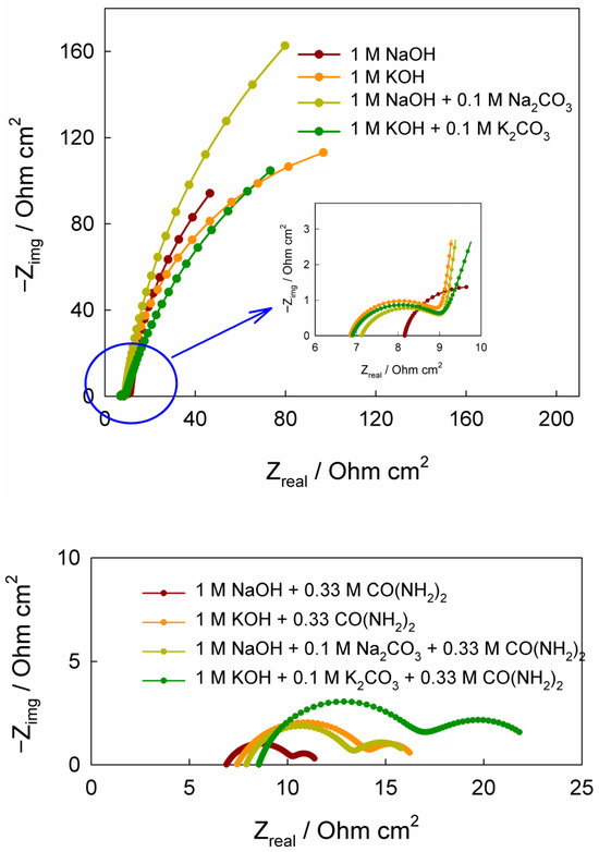 From a practical perspective, the obtained results are important for optimizing electrolytes intended for water electrolysis involving the urea oxidation process. In conventional alkaline electrolyzers operating via the HER/OER scheme, potassium hydroxide solutions are generally considered more favorable due to their higher ionic conductivity, which reduces the cell voltage and lowers energy consumption. However, in systems where urea oxidation replaces the oxygen evolution reaction, our results reveal a different scenario. In particular, the equivalent circuit parameters indicate that in NaOH + urea, RP1 values increase only slightly, whereas RP2 drops sharply to a few ohm cm2, reflecting the effective activation of the low-frequency channel of electrochemical transformations and accelerated progression of the key UOR steps. This suggests that in sodium-based electrolytes, urea does not block active sites in the high-frequency regime, while simultaneously significantly enhancing the direct oxidation mechanism.