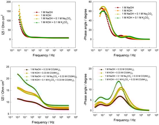 The introduction of urea fundamentally changes the system’s behavior. In alkaline solutions containing CO(NH2)2, the phase angle maxima (at higher frequencies) become markedly lower: 6.8° at 16.6 Hz and 11.0° at 26.9 Hz for NaOH and KOH, respectively. Such a dramatic shift into the high-frequency region may indicate the emergence of rapid capacitance-controlled processes associated with the interaction of urea molecules with the surface of Ni-containing sites and with the modification of the interfacial layer at the atomic level. The phase shift decrease may also suggest partial destabilization or subtle structural changes in the NiOOH phase, making the surface reaction less “RC-like” and closer to the behavior of a system dominated by ohmic resistance.