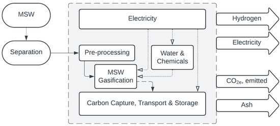 System boundary for the base case (gray box); MSW feedstock and separation, from a material recovery facility, are outside the system boundary; electricity generation; feedstock pre-processing and gasification; carbon capture, transport, and storage to a saline aquifer; and the chemicals and water used for gasification are modeled; co-products include H2 and excess electricity. The solid line with solid arrow represents the feedstock flow through separation, pre-processing and gasification. The dotted line with empty arrow represents the energy and material flows (i.e., water, and chemicals) found within the system boundary. The dashed line with a solid arrow is the captured carbon from feedstock gasification. The following figures are the same.