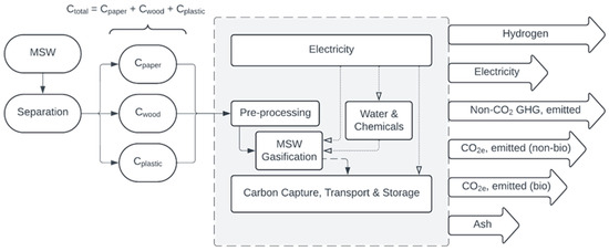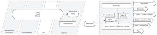 A gasification pathway of MSW to hydrogen (H2) was simulated to illustrate the implications of the three LCA accounting methods. There are many waste-to-energy pathways for MSW, including incineration, hydrothermal carbonization, pyrolysis, gasification, and biological methods such as anaerobic digestion that lead to potential products such as solid refuse fuel/refuse-derived fuel, sustainable aviation fuel, heat and power, and renewable chemicals (e.g., methanol) [14,38]. One pathway is the gasification of MSW to produce H2, a carbon-free energy carrier and feedstock found in several markets (e.g., ammonia production, food and drug hydrogenation, petrochemical refining, and glass manufacturing) and emerging as a potential option for decarbonizing three fossil-heavy sectors, namely transportation, electricity generation, and manufacturing [39,40,41]. The gasification of MSW involves converting what is predominantly biomass (e.g., wastepaper, cardboard, wood, and other mixed organics) to syngas, introducing virtually no new carbon into the atmosphere [42]. Syngas is a mixture of H2 and carbon monoxide (CO) and is a precursor in the production of chemicals and fuels, including H2 production.