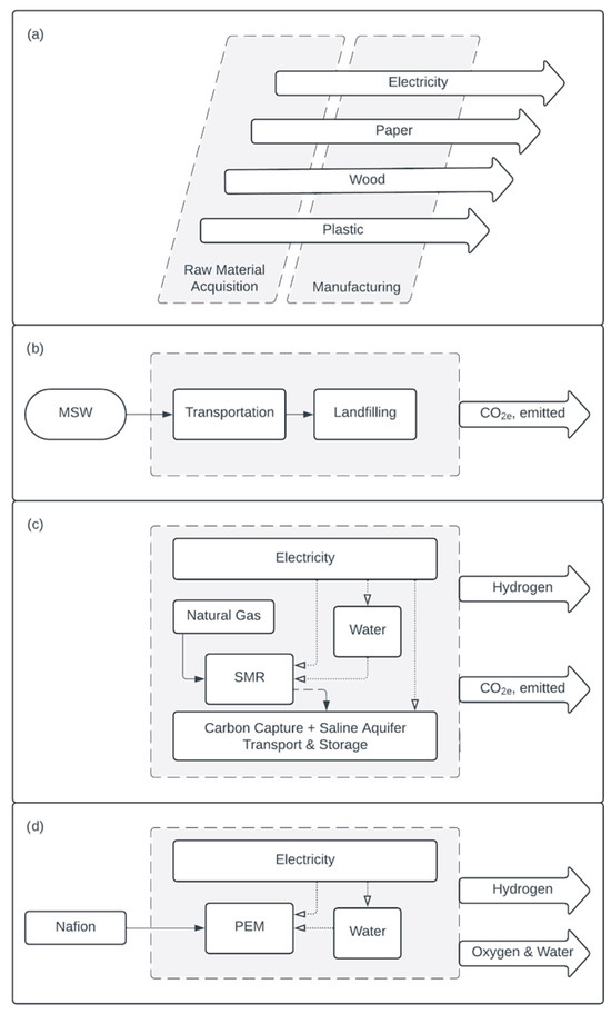 The PEM unit process was designed with a multi-functioning functional unit via system expansion and uses the same processes for electricity generation; MSW landfilling; and paper, plastic, and wood production, as used in the business-as-usual case. Figure 4 shows the processes for the counterfactual benchmark case (i.e., Figure 4a,b,d).