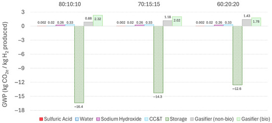 The total GWP of these cases and scenarios (in kg of CO2e per kg of H2 produced) is provided in Table 7. A secondary total column (Total *) is computed for comparison purposes to demonstrate cases without biogenic carbon accounting (i.e., with non-zero biogenic carbon emissions and without biogenic carbon sequestration), without electricity co-production, and without landfilling impacts.