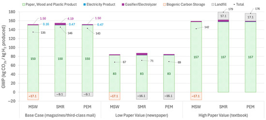 A sensitivity analysis was performed on the four cases using an output-based functional unit (i.e., 1 kg of H2 produced) by increasing the percentage of wood and plastic in the MSW composition from the base case. Two alternative scenarios were examined: (1) 70% paper, 15% wood, and 15% plastic and (2) 60% paper, 20% wood, and 20% plastic.