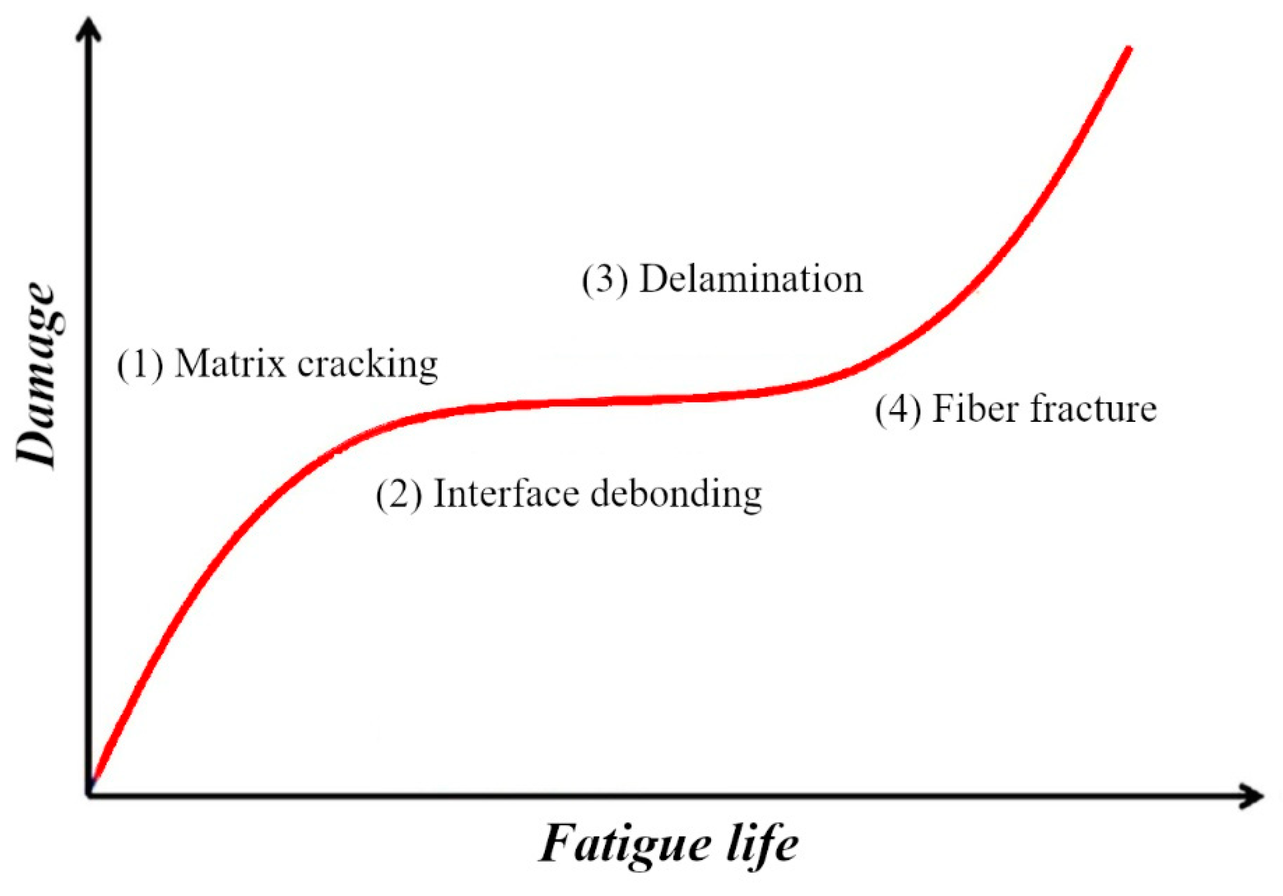 - Initial Phase: Rapid damage accumulation marked by matrix microcrack formation and propagation along off-axis fiber directions under tensile stresses.
