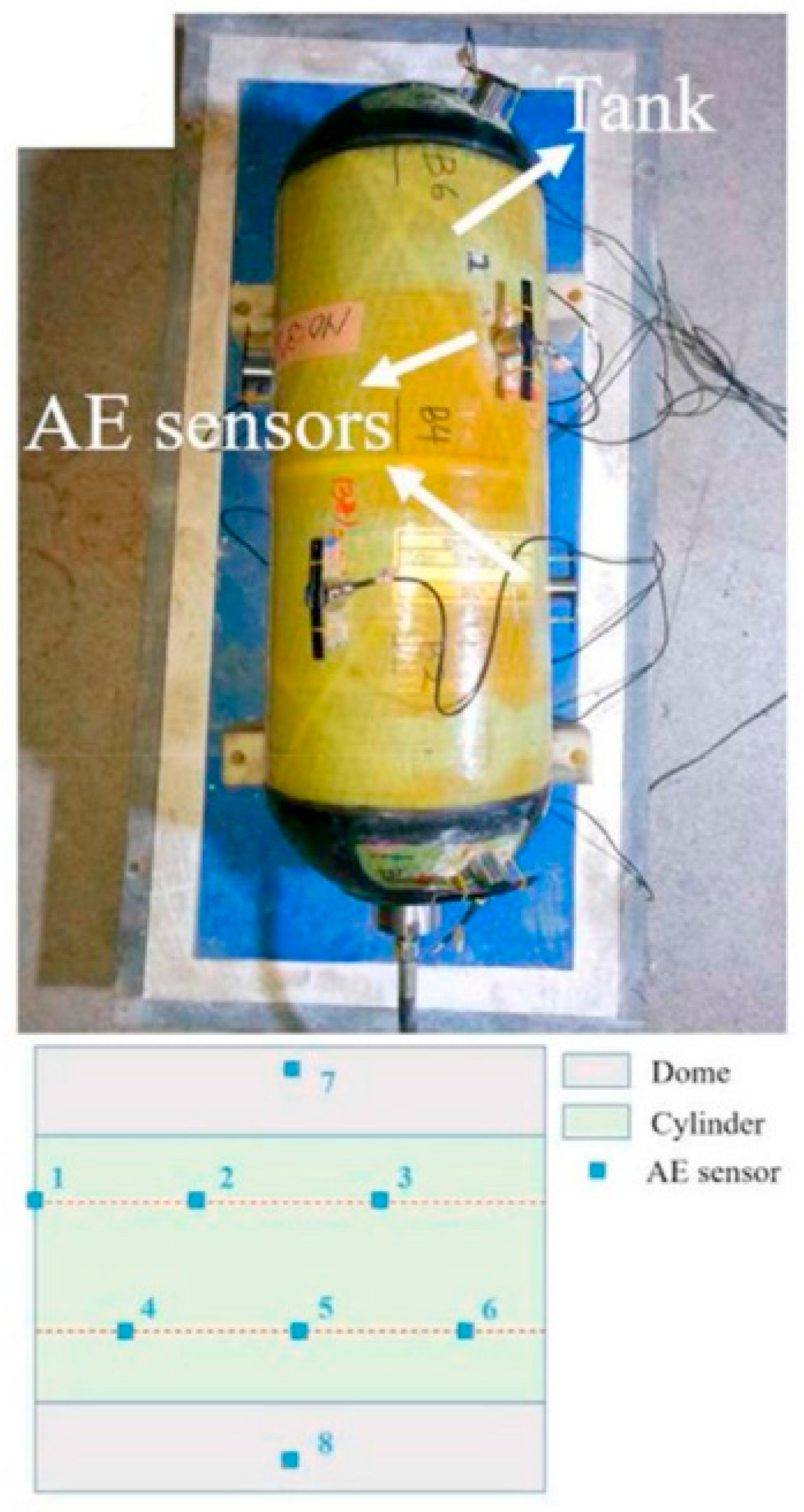 - Wang, D.; Liao, B.; Hao, C.; Wen, A.; Zheng, J.; Jiang, P.; Gu, C.; Xu, P.; Huang, Q. Acoustic Emission Characteristics of Used 70 MPa Type IV Hydrogen Storage Tanks during Hydrostatic Burst Tests. Int. J. Hydrogen Energy 2021, 46, 12605–12614. [Google Scholar] [CrossRef]