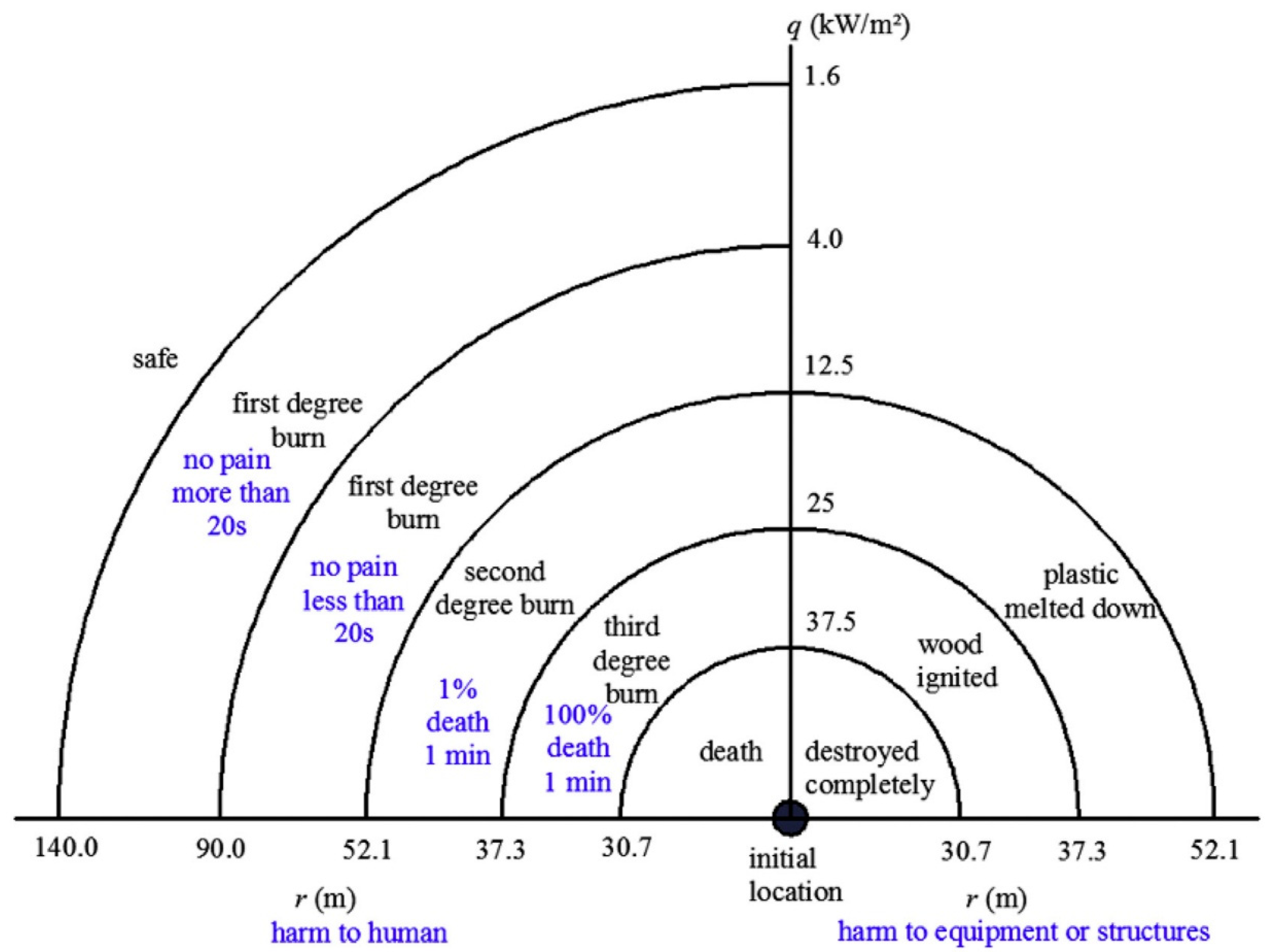 - Fire Protection. Another vulnerability concerns the behavior of tanks in fire conditions. When exposed to intense flames, tanks can experience degradation of the composite shell and liner, leading to structural failure and potentially hydrogen release [143,144]. Fire-resistant materials, such as ceramic fiber-reinforced composites, increase the resistance of Type IV tanks to high temperatures, providing a temporary barrier in the event of a fire [100,143]. DOT CFR 49—Part 178 establishes fire and impact resistance requirements, ensuring that tanks maintain structural integrity even during prolonged exposure to flames [145]. Shen et al., in [146], investigated the consequences associated with the explosion due to high-pressure tank rupture during fire tests. They analyzed the hazard range of the fireball for both humans and structures. The results, shown in Figure 18, indicate that humans are only safe beyond 140 m, while structures are protected at distances greater than 52 m.