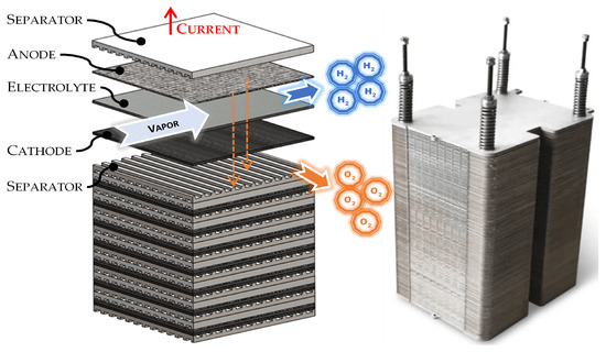 The growth of the human population combined with economic development leads to an increase in global energy consumption. Increasing energy consumption makes it more difficult to transition energy systems based on fossil fuels to low carbon energy sources []. Renewable energy sources such as solar energy, wind power, hydropower, bioenergy, and geothermal power are considered environmentally friendly technologies. Developing clean and sustainable energy systems is one of the most important problems facing the world in this century, with the aim of decreasing carbon dioxide emissions. The main renewable sources for green energy technologies, such as solar and wind sources, are variable sources with fluctuating nature. The integrated energy system can include smart combinations of technologies so that energy supply and demand are matched in both time and space []. Therefore, aiming to establish an energy system in green technology requires definitively a storage energy solution. An optional energy carrier can be considered to be the green hydrogen used also to store and transport renewable energy, thus playing a pivotal role in the global energy transition []. In the green energy system, the hydrogen is generated through electrolysis of water using electricity sourced from renewable sources, reducing dependence on fossil fuels and greenhouse gas emissions []. hydrogen energy systems have been examined in various studies as integrated green hydrogen production with a single energy source, or as hybrid renewable energy systems [,,,,,]. hydrogen can be produced via water electrolysis in multiple ways as: Alkaline Water Electrolyzers (AWE); Anion Exchange Membrane Water Electrolyzers (AEMWE); Proton Exchange Membrane Water Electrolyzers (PEMWE); Solid Oxide Electrolysis Cell (SOEC); Proton Conducting Ceramic Electrolyzers (PCCEL) []. However, low-temperature electrolysis requires electro catalysts based on noble metals and energy to split water into hydrogen and oxygen, resulting in low energy conversion efficiency and high cost of hydrogen production []. Electrolyzers at high temperature (500 °C–850 °C) based on a solid oxide electrolytic cell (SOEC) or a solid oxide fuel cell (SOFC) are considered a better solution due to the thermodynamic and electrochemical kinetic conditions of the reaction not limited by Carnot efficiency []. SOEC uses a solid and dense ceramic oxide membrane separator that conducts ions at elevated temperatures to split water in the form of steam into pure hydrogen and oxygen. Reversible solid oxide fuel cells (RSOFC) operate in both fuel cell and electrolysis modes as a reversible system characterized by high energy storage efficiency, environmental friendliness, low development cost and high market conversion rate [,,]. Generally, the SOEC is developed using multi-stack modules to increase production quality and heat distribution throughout the stack during operation (Figure 1). The specifics of SOEC/SOFC functionality at high temperatures require a thermal process of the incoming fluids. The electrolysis process comprises gas reaction of water and steam at an elevated operating temperature reaching up to 1000 °C and hot exhausted outgoing gases. Many studies focus on optimizing the thermal efficiency of the component Solid Oxide Electrolysis systems, particularly in the context of high-temperature steam generation [,,,,]. To improve the hydrogen production efficiency, theoretical models of SOECs for water electrolysis are developed to reveal the electrochemical and thermal characteristics. The analysis of thermodynamic performance can provide suggestions for more efficient use of heat waste. Recovery of steam water waste heat could improve hydrogen utilization and decrease the heat consumption.