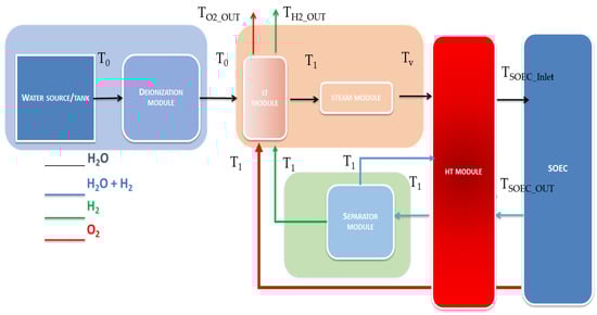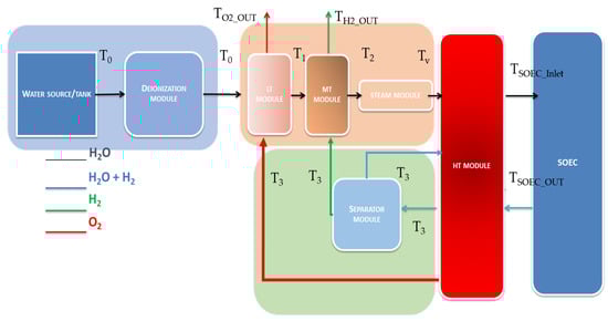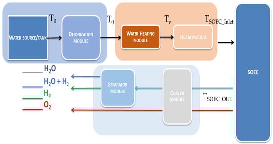 In SOEC system the steam water at the outlet of the separator module is recycled back to the HT Module in an closed-loop system. The temperature of the mixture steam water and hydrogen vapor exiting at the outlet of SOEC module () decreases to so that the cooling process is involved to heat transfer to the HT module. A contribution amount of energy occurring in the HT module is a sum of released energy when the outgoing steam water from SOEC module decreases the temperature to and the outgoing hydrogen from SOEC module decreases the temperature to , as reported in Equation (14):