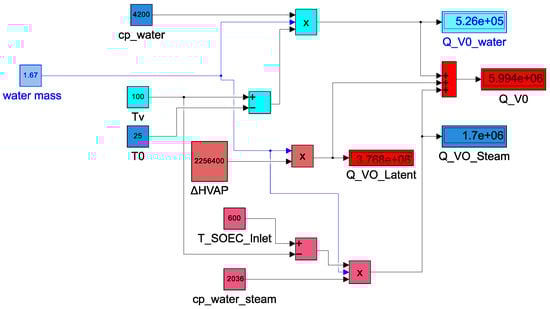 In the second thermal/cooling model of the Simulink block diagram is proposed the calculation of the total thermal and cooling energy demand for the MODEL Elcogen E350 stack system with the recirculation of waste heat with components of low module and high module. In SOEC System block diagram based on model Elcogen E350 stack, the temperatures considered are the ambient temperature of 25 °C, the temperature at LT module outlet of 95 °C, the vaporization temperature is 100 °C, and are respectively the temperature of oxygen and hydrogen with the same value of 30 °C leaving the system, and the SOEC operating temperatures and are 600 °C and 700 °C respectively indicated by the manufacturer of Elcogen E350 stack. In the Elcogen E350 Solid Oxide Electrolyzer system uses tap water as a starting material of 1 kg to produce hydrogen of 0.125 kg. At the entrance of SOEC electrolyzer the steam water is of 1.67 kg. It splits this steam water at the outlet of SOEC into water (0.67 kg), hydrogen (0.125 kg), and oxygen (0.875 kg). The specific heat capacity parameters in the range of temperature used in the computational model as reported in the Table 2 are integrated over time using the values described in [,,].
