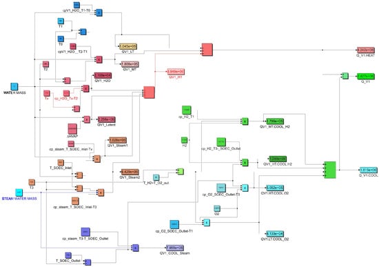 Simulink block diagram of thermal heat transfer in SOEC system low, middle, and high-temperature heat exchangers ().