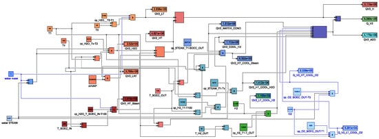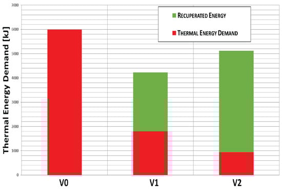 The heat energy is 5115.03 kJ, the recuperated cooling energy is 4176.11 kJ, the overall needed energy is 938.92 kJ as shown in Figure 7. The Simulink block model shows the implementation of all equations (Equations (22)–(33)) reported in Section 3.2.