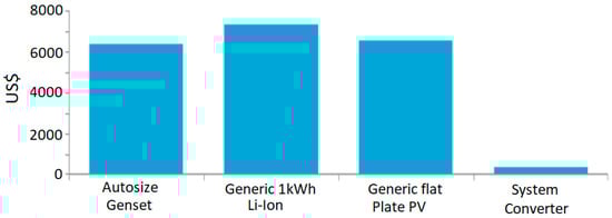 The high cost of the system for each city is due to the high cost of the battery and PV module compared with other components. The system’s electricity production is mainly generated by the PV module, as shown in Figure 6. The diesel generator therefore acts as an alternative solution (preventive in case the PV does not meet the load) in electricity production, which means that the PV alone could meet the demand in each city according to the trend shown in Figure 6.